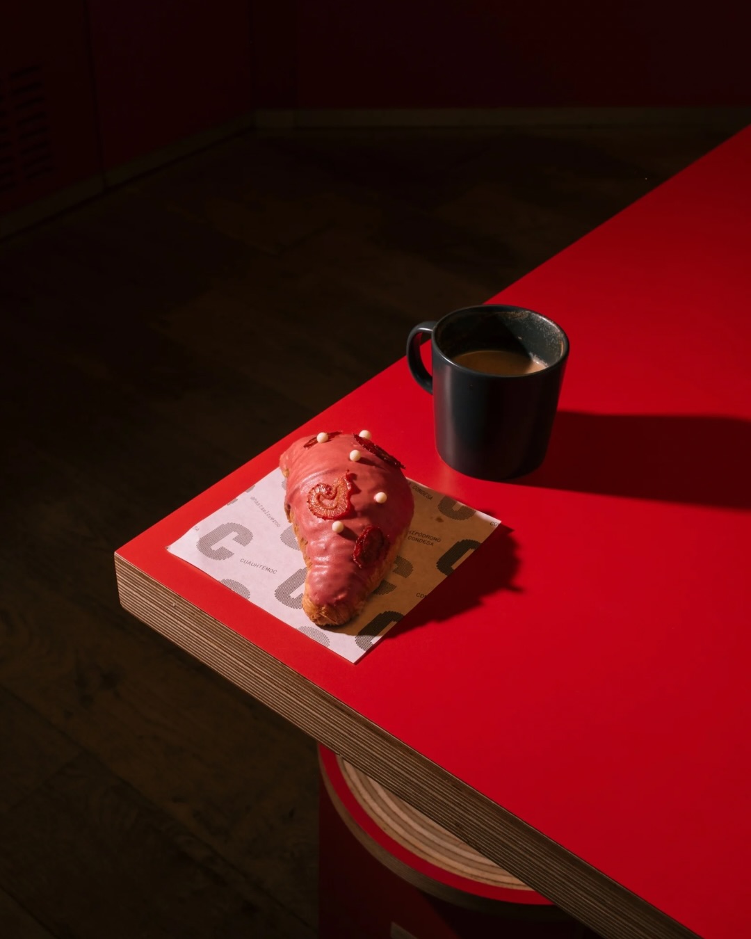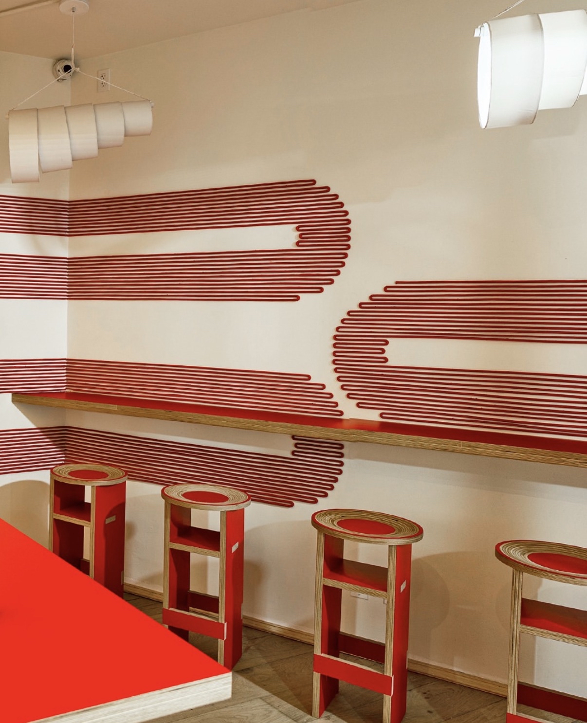 The stool is an exercise in essentiality: its strength is derived from interlocking planes of red plywood. The materials' stratified edges echo the very essence of the cuerno, as a textural homage. The bold, saturated red serves as both a statement and an anchor within the space.