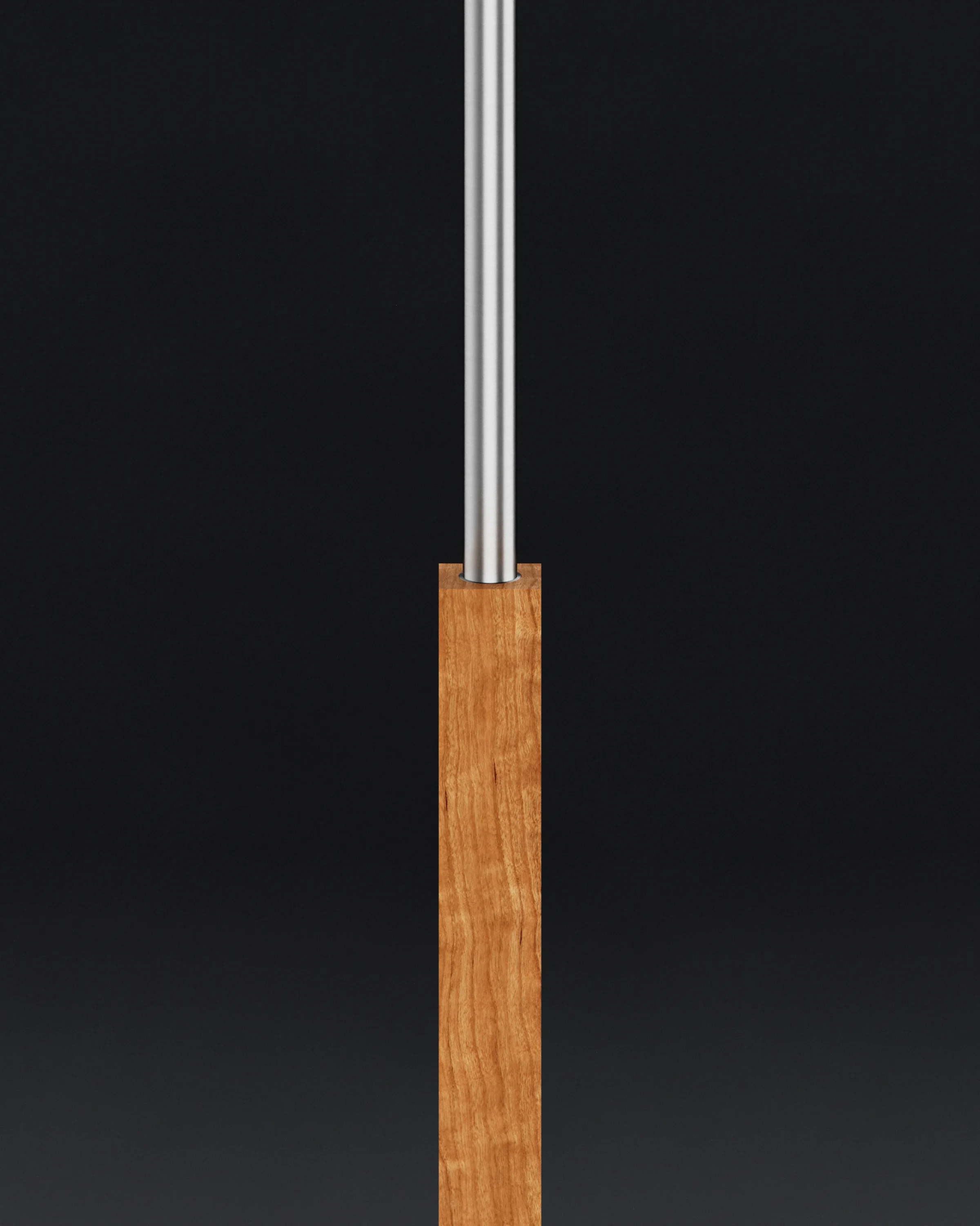 The body is made of wood, precisely machined. Inside, a led tube breathes through a grid of fine holes: when the light is off, it’s a column; when it’s on, the wood turns translucent, like paper. The light is diffused by the thinnest layer of wood. The structure borrows the firmness of Milá’s Cesta and the quiet diffusion of Coderch’s pine-made DISA: both reminders that wood can hold, and also let go.